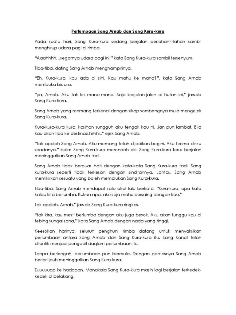 Video Kura Kura Benar Benar Tapau Arnab Dalam Perlumbaan Apa Penjelasan Sains Axello from axello.net Fabel berisi cerita pendek antara kerbau dan kambing di atas memuat tema persahabatan dan pentingnya saling membantu sesama. Nampaknya, kamu tidak akan mungkin bisa berkeliling dunia. posted by unknown at 6:24 am. Kesimpulan dari cerita ini menunjukkan bahawa usaha itu tangga kejayaan. Kakinya dapat ditekuk seperti layaknya lutut. 2.saya berlari dengan cepat kerana kaki saya panjang. 446 reads 49 votes 1 part story. Arnab dengan kura kura from zailahr1971.
