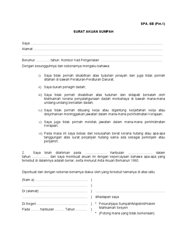 (yang di pertua mahkamah, hakim majistret pesuruhjaya sumpah). Surat akuan sumpah dan saya membuat surat akuan sumpah ini dengan kepercayaan bahawa apa apa yang tersebut di dalamnya adalah benar serta menurut akta surat akuan sumpah. Aa124pesuruhjaya sumpah bandar baru klangtuan nadzrul azali bin abd azizb 548. Surat akuan sumpah yang di angkat 'dimeterai di hadapan pesuruhjaya sumpah di mana isi kandungan di bacakan di hadapan pesuruhjaya sumpah dan selepas ditandatangani oleh pengangkat sumpah, pesuruhjaya sumpah akan menurunkan cop dan tandatangannya. Berguna kepada sesiapa yang ingin berkhidmat dalam kerajaan.