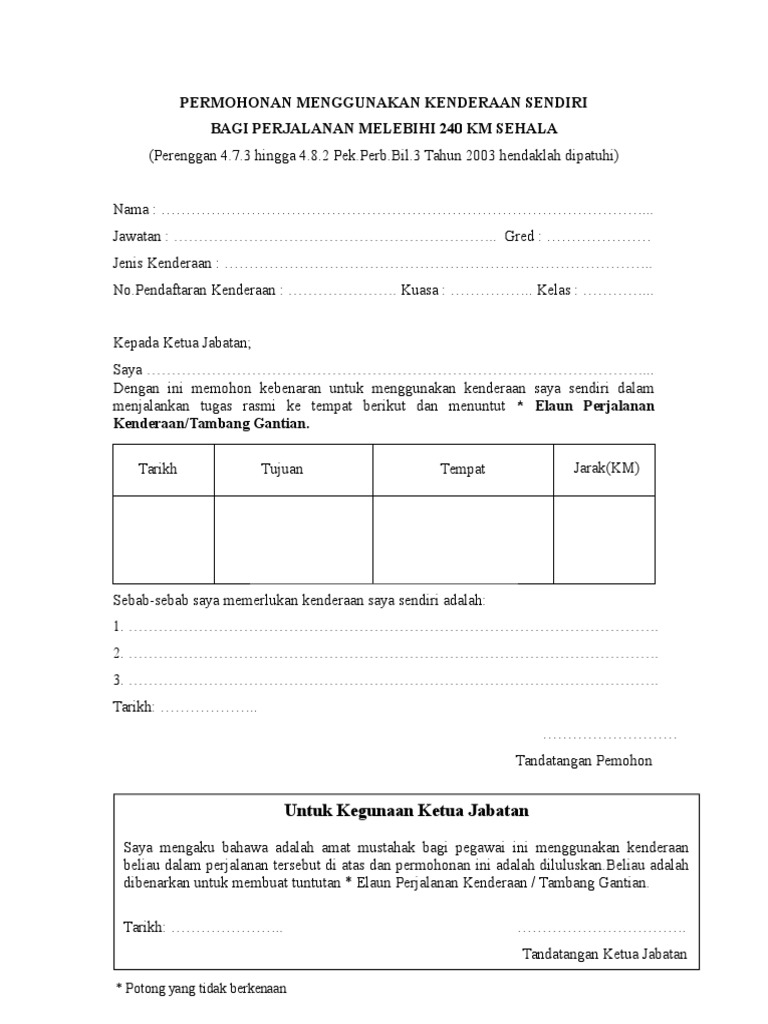 2.7 penggunaan kenderaan bagi tempoh melebihi sehari semalam For more information and source, see on this link : 5.8.1 seseorang pegawai yang menggunakan kenderaan sendiri untuk bertugas di satu tempat sahaja yang jaraknya melebihi 240 km daripada ibu pejabatnya dan terdapat perkhidmatan terus kapal terbang atau kereta api layak menuntut tambang gantian; Permohonan tuan/puan untuk menggunakan kenderaan sendiri dan menuntut elaun kilometer adalah diluluskan. _____ hingga _____ ini merupakan kali : 3 borang kebenaran menggunakan kenderaan sendiri/ perjalanan melebihi 240 km/ tambang gantian (rujuk rtm/tnt/01) *kecuali pemandu / pembantu operasi 4 i) penyata touch n go (bagi yang menggunakan kad tng) ii) resit tol (bagi yang tidak menggunakan kad tng) 5 laporan kehadiran pegawai bertugas / kad perakam waktu Dengan ini saya memohon kebenaran tuan untuk menggunakan kenderaan saya sendiri bagi kemudahan menjalankan. 2.5 pengguna kenderaan dikehendaki mengisi borang soal selidik kepuasan pelanggan bagi pihak kami mengukur tahap perkhidmatan penggunaan kenderaan di bahagian ini. Lampiran 2 contoh senarai tugas hakiki. Borang kebenaran menggunakan kenderaan sendiri. Kebenaran ini diberikan untuk membawa murid bagi urusan rasmi kementerian pendidikan malaysia. Borang permohonan untuk menggunakan kenderaan sendiri dan menuntut elaun kilometer bagi jarak melebihi 240km sehala. Atas tugasan rasmi dan penting tiada kenderaan jabatan disediakan dan mempunyai alasan yang munasabah untuk menggunakan kereta sendiri pegawai perlu isi borang kebenaran membawa kenderaan sendiri boleh.